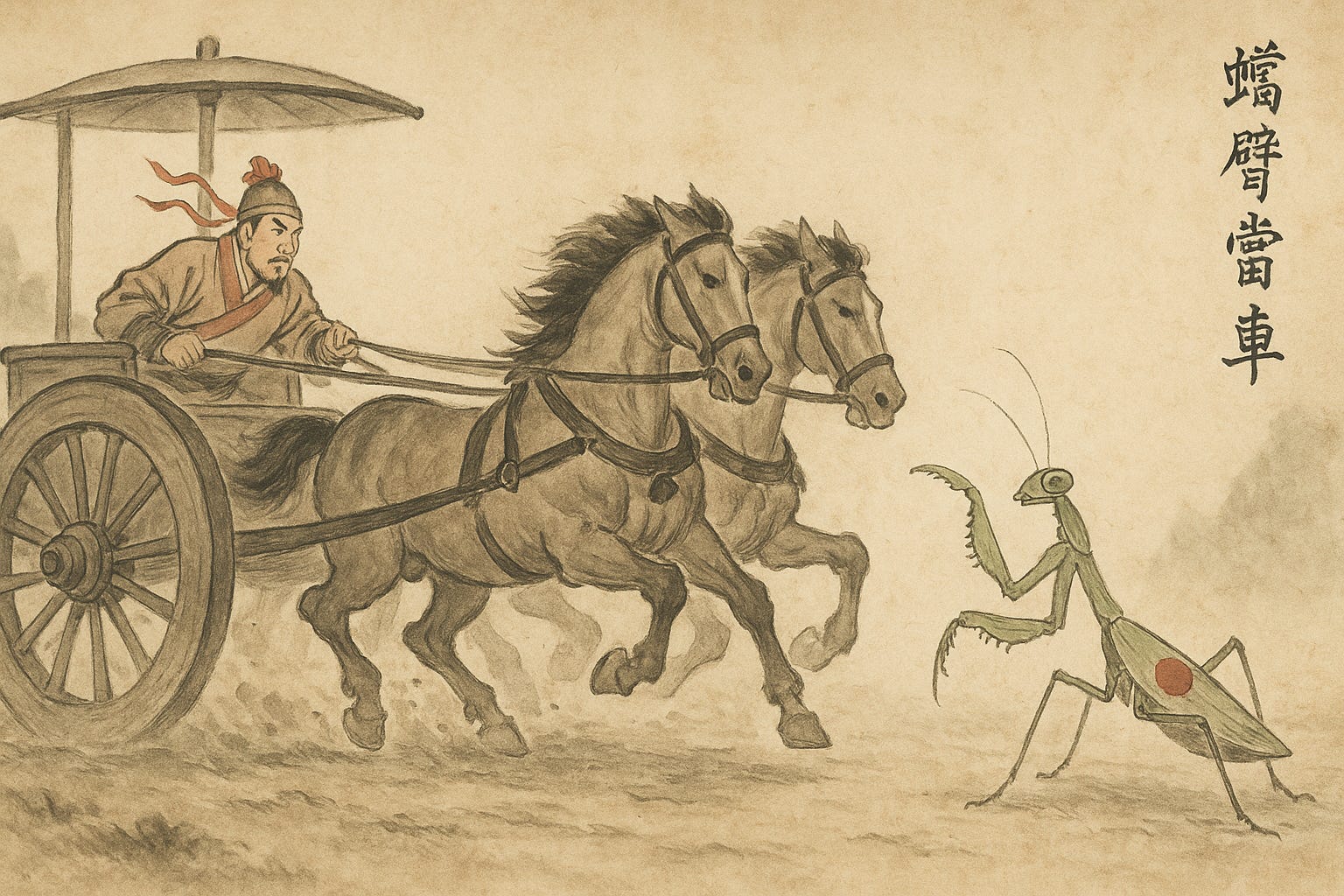 Beyond outrage, the dominant sentiment is confidence. Writers repeat the foreign ministry’s warning that “those who play with fire will get burned” (玩火者必自焚). Again and again, colourful — and often quite violent — imagery is deployed to hammer home the futility of Japan’s actions. A favourite metaphor likens Japan’s attempt to obstruct unification to “a mantis raising its arms to stop a chariot” (螳臂当车).